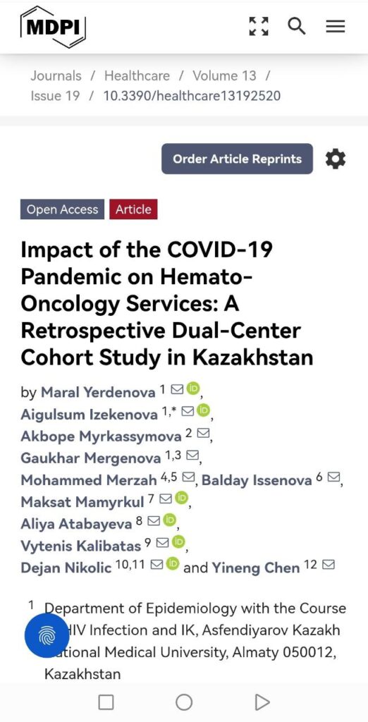نشر الأستاذ المساعد الدكتور محمد عبد الرضا مرزة، رئيس قسم صحة المجتمع في كلية البوليتكنك كربلاء – جامعة الفرات الأوسط التقنية، بحثاً علمياً بعنوان: “تأثير جائحة كوفيد-19 على تقديم الخدمات الصحية لمرضى الدم والأورام: دراسة استرجاعية ثنائية المركز في كازاخستان”، في مجلة علمية عالمية رصينة ضمن مستوعبات سكوبس (Scopus).