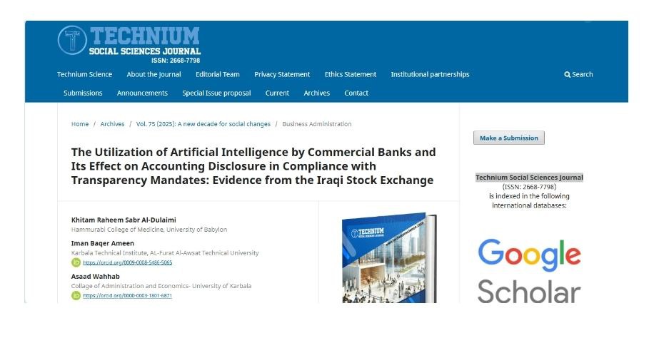 نشر فريق بحثي مشترك من جامعة الفرات الأوسط التقنية كلية البوليتكنك كربلاء وجامعتي كربلاء وبابل بحثاً علمياً بعنوان “استخدام الذكاء الاصطناعي من قبل البنوك التجارية وأثره على الإفصاح المحاسبي امتثالاً لمتطلبات الشفافية: دليل من سوق العراق للأوراق المالية” في مجلة Technum Social Sciences Journal الصادرة في رومانيا.