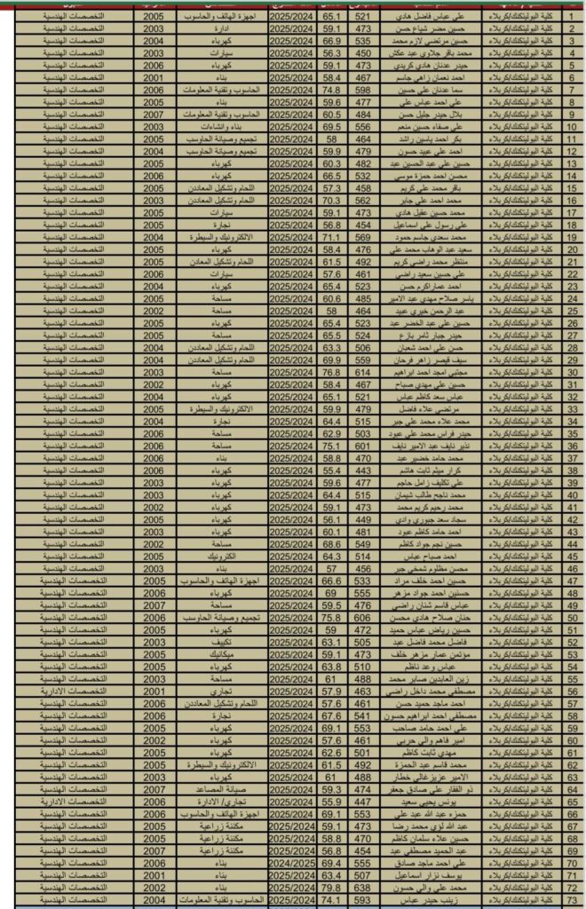 تعلن كلية البوليتكنك – كربلاء في جامعة الفرات الأوسط التقنية عن بدء تسجيل الطلبة الجدد المقبولين في الدراسة الصباحية للعام الدراسي 2025 – 2026 من خريجي الدراسة الإعدادية المهنية (الدور الثالث) للاسماء الواردة في الجدول ادناه: