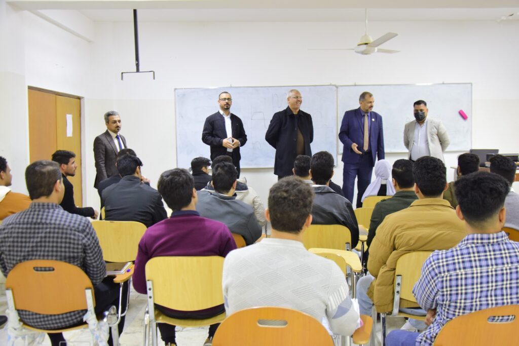 وخلال الجولة، التقى السيد العميد بالطلبة أثناء المحاضرات، واطّلع على واقع العملية التدريسية، مؤكّدًا أهمية الالتزام بالدوام الرسمي والجدية في التحصيل العلمي، فضلًا عن تشجيعه الطلبة على التفاعل الإيجابي مع المناهج الدراسية والاستفادة من الإمكانات التعليمية المتاحة.